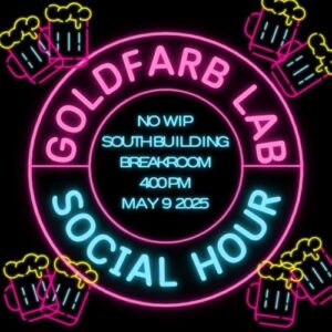 Social Hour Hosted by the Goldfarb Lab May 09, 2025 4:00 p.m.-5:00 p.m. Events 4th Floor Break Room, South Medical Building, 660 S. Euclid Avenue, Saint Louis, MO 63110 Add to: Google Calendar | Outlook | iCal File