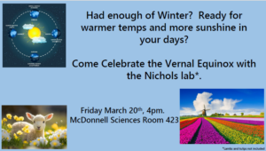 Social Hour Hosted by the Nichols Lab Mar 20, 2026 4:00 p.m.-5:00 p.m. Events McDonnell Sciences, 4th Floor, Room 423, 660 Euclid Ave, St. Louis, MO 63110 Add to: Google Calendar | Outlook | iCal File